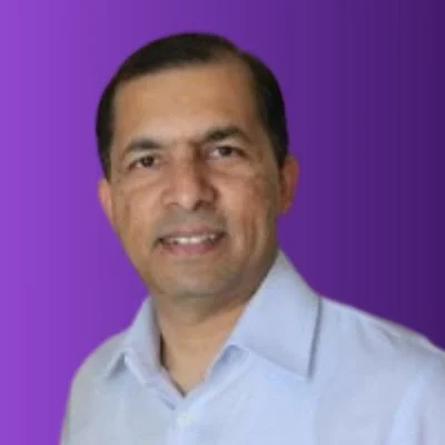 Smiling man with dark hair, wearing a checkered shirt, against a purple background.