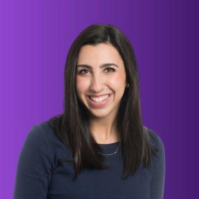 A woman with long dark hair and a blue shirt smiling against a purple background.